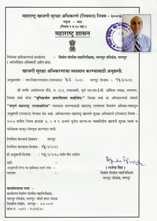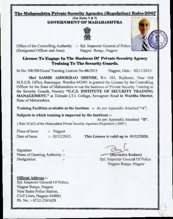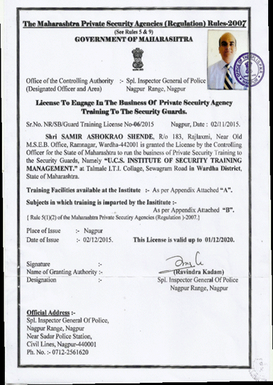 The Maharashtra private security Agencies (Regulation) Act 2007 (For providing security personnel)We have registered Licensed to conduct training under the banner of UCS Institute of Security Training Management is the Government Recognized Security Training provider vide Government License No. NR/SB/Guard Training License No.06/2015 nd Nagpur Date 2 November 2015 issued of the private Security agencies (Regulation) Act 2005 permitted to conduct the Security Training Programme for civilian Security Guard/ Ex-serviceman/ Ex-Police personnel of the private Security agencies (Regulation)Rules 2007.
